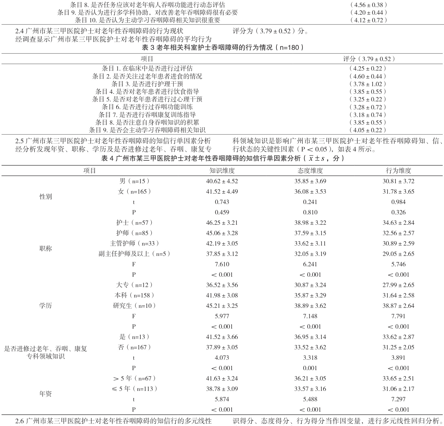 对 180 份调查问卷结果进行整理,汇总护士对老年性吞咽障碍认知、态度、行为评分及影响因素分析。