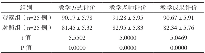 观察组,基于多元评估体系带教模式:(1)教学评价:基于上一年的教学现状展开多方面评估,基于实习医生完成的各项调查问卷进行综合评价,包括对教学方式、老师、成果的评价,分析常规教学模式中存在的问题,了解实习医生的教学预期目标,拟定符合实习医生的教学目标及教学方案。(2)教学实施:基于教材内容、教学大纲与胃肠外科工作内容,引入先进教学模式,拟定具体科学且符合教学课时的教学方案。在教学前,要求实习医生 5 人一组,选出一位小组长,小组长结合教学老师发放的教学任务,带领小组成员进行课下自主学习。教师结合教学内容,筛选出重难点,制作为微课,提前一周上传至教学群,要求实习医生下载微课,提前预习,熟悉教学计划,自主学习难度偏低的基础知识。教师布置教学任务,实施任务驱动教学模式,让实习医生以小组为单位完成任务,并在课堂教学过程中讲授任务完成过程与任务完成结果,教师与其他实习医生认真倾听,并进行点评,提出问题,要求小组成员回答问题。最后教师对教学内容进行总结,及时补充内容,及时纠正错误。完成理论知识教学后,安排实习医生进行实操,提供训练室熟悉各项胃肠外科技能。