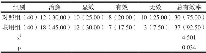 联用组治疗总有效率( 92.5% )高于对照组( 75.0% ),差异有统计学意义( P<0.05 )。见表1。