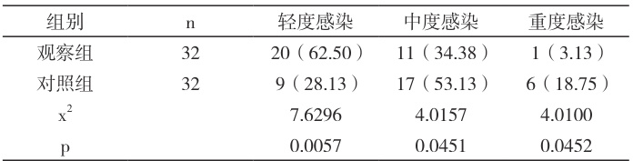 观察组中度、重度感染率显著更低,轻度感染率显著更高,p 均<0.05 ,见表 1。