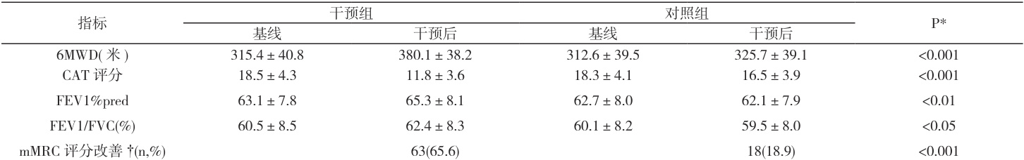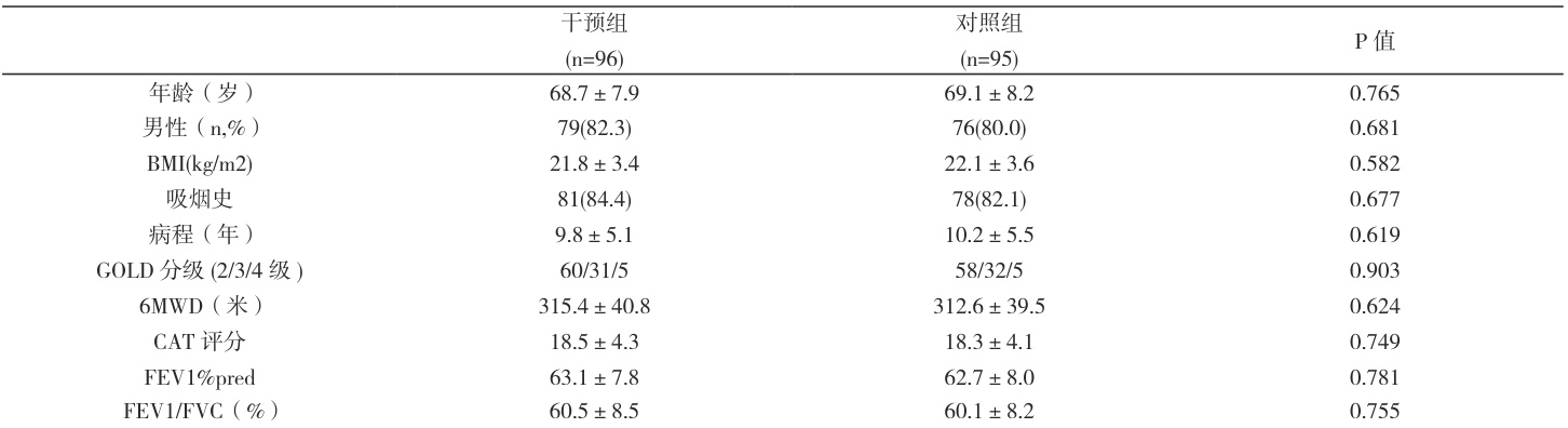 本研究最终有191例患者完成随访并纳入分析,其中干预组96例,对照组95例。两组患者在年龄、性别、BMI、吸烟史、病程、GOLD 分级及各项观察指标的基线水平等方面比较,差异均无统计学意义(P>0.05),具有可比性(表1)。