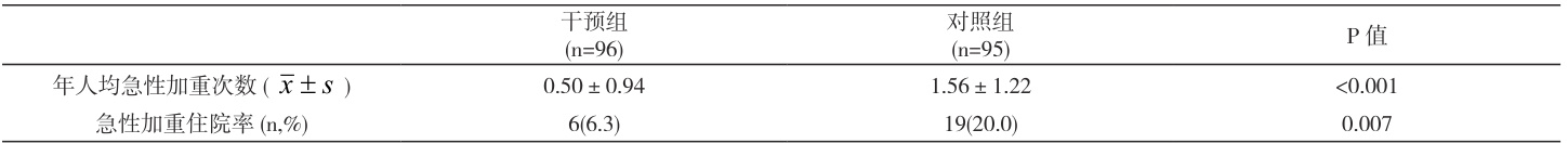 在干预期间,干预组的年人均急性加重次数和因急性加重住院的比例均显著低于对照组(P<0.05)。详见表3。