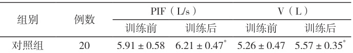 吸气肌指标:测定吸气峰值流速(PIF)、吸入空气量(V)。时间:训练前、后。