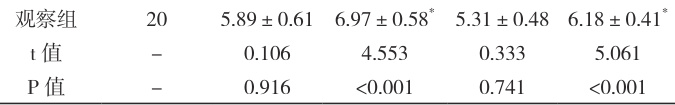训练前( P>0.05 );训练后,观察组 > 对照组( P<0.05 ),见表 1