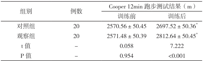 训练前( P>0.05 );训练后,观察组心肺耐力 > 对照组,差异明显( P<0.05 )。见表2。