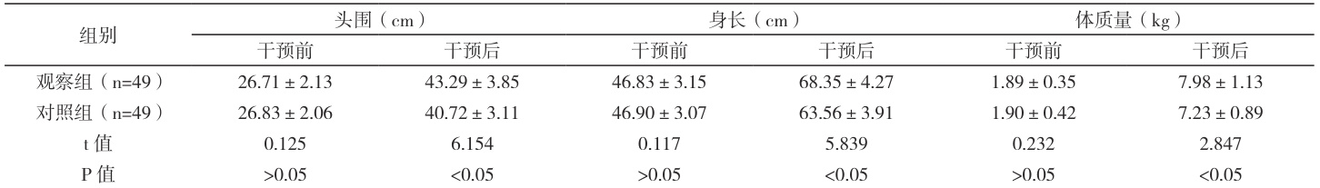 观察组早产儿的头围、身长、体质量,均大于对照组( P<0.05 )。见表1 :