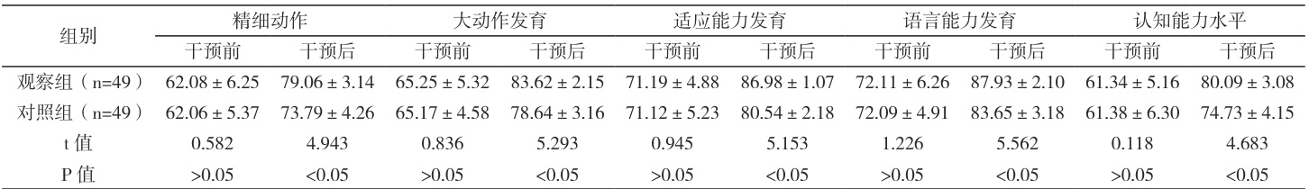 对照组实施常规保健指导,观察组给予儿童保健指导,方法: ① 运动指导:护理人员需指导早产儿家长对早产儿进行系统的肢体功能训练,包括上肢、下肢的屈伸活动及肩关节的被动运动,并定期协助完成翻身动作。同时,通过环抱轻摇的方式给予前庭刺激,促进平衡能力发展。此外,应向家长详细示范家庭运动训练方法及注意事项,确保出院后训练的延续性和安全性。 ② 营养管理:护理人员要指导家长为早产儿提供高蛋白配方奶粉及富含铁质的辅食,同时注意维生素A、D 及铁元素的均衡补充。建议每日安排适量户外活动,通过日光照射促进钙质吸收,满足生长发育所需营养。 ③ 认知训练:根据早产儿月龄特点制定个性化训练方案,向家长传授现代早期教育理念。例如在婴儿床悬挂色彩鲜艳的玩具引导抓握练习;通过语言交流、表情互动及声音刺激进行视听训练;定期组织户外亲子活动,帮助早产儿逐步适应外界环境。 ④ 抚触干预:指导家长在两次哺乳间隙,使用婴儿专用润肤油对早产儿进行全身抚触,按臀背部、腹部、四肢、头部的顺序进行,每次 15-20 分钟,以促进神经发育和亲子情感联结。 ⑤ 语言与动作训练:采用玩具诱导法吸引早产儿注意力,通过互动游戏诱发笑声;每日定时播放舒缓儿歌进行听觉训练;指导家长协助完成翻身、坐起等大动作练习,以及弯腰拾取玩具等精细动作训练,促进运动功能协调发展。