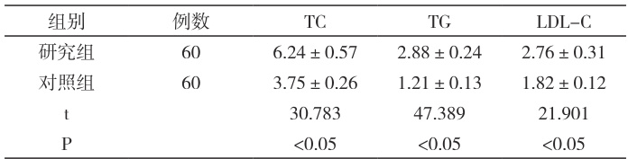 研究组TC、TG、LDL-C 均较对照组高( P<0.05 )。见表 1