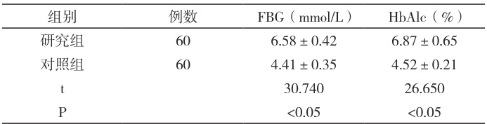 研究组FBG、HbAlc 均较对照组高( P<0.05 )。见表2。
