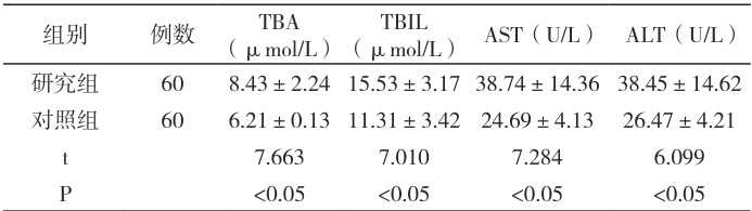 研究组 TBA、TBIL、AST、ALT 均较对照组高( P<0.05 )。见表