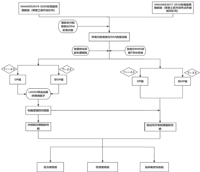 本研究选取 NHANES 2019–2020 年数据作为模型开发队列,2017–2018 年数据作为外部验证队列。纳入年龄 ⩾50 岁,完成股骨骨密度及实验室检查者;排除既往OP 诊断或治疗、激素用药史、严重系统疾病患者。