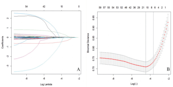 图1:A 图- 避免模型的过度拟合,本研究采用正则化技术的Lasso回归筛选变量,随着惩罚系数增加相关系数逐渐被压缩为0 ;B 图-通过十折交叉验证法筛选最合适的测因子,选取lambda 的最小值(0.01113358) 所对应的预测因子变量