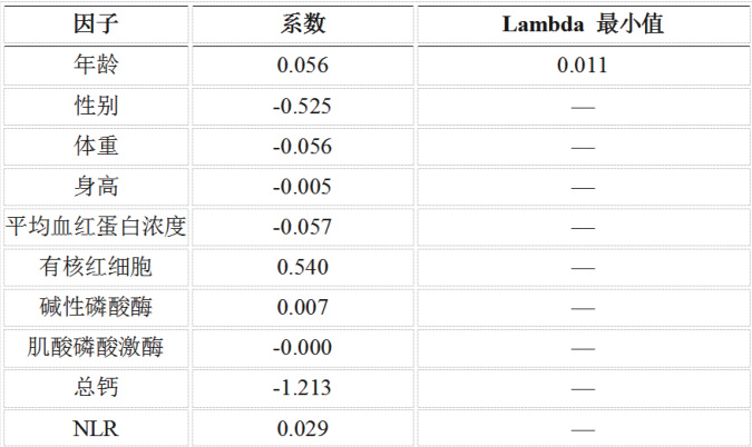 使用 LASSO 回归筛选出最有价值的预测因子组合,LASSO 回归分析临床趋势线如图1 所示,各变量LASSO 回归系数见表 2