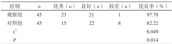 以实施乳腺癌根治术治疗的 90 例乳腺癌患者为研究对象,所有患者均对本次的研究内容知情同意。以随机的方式对所有患者进行分组,观察组 45 例,平均年龄( 49.18±2.25 )岁,左侧病变 23 例,右侧病变22 例;对照组45 例,平均年龄( 48.29±2.31 )岁,左侧病变24 例,右侧病变 21 例。对两组患者的一般资料分析后显示差异不显著( P> 0.05),具有可比性。
