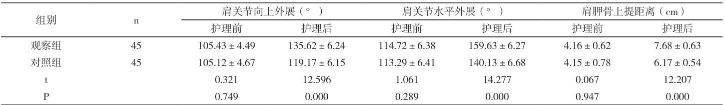 对比两组康复效果及上肢功能恢复情况。康复效果根据患者康复锻炼后肢体功能恢复情况划分等级:肢体功能得到显著恢复,生活质量明显提升,为优秀;肢体功能有一定的改善,生活质量有所提升,为良好;未达到以上标准的为较差。计算两组的优良率。上肢功能恢复情况采用肩关节向上外展、肩关节水平外展以及肩胛骨上提距离来衡量,所得数值越大则上肢功能恢复越好。
