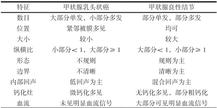 甲状腺乳头状癌与甲状腺良性结节的超声征象存在显著差异。甲状腺乳头状癌多为单发,形态不规则、边界不清,纵横比 ⩾1 多见,内部以低回声 / 弱回声为主,微钙化灶更典型,血流信号不明显。甲状腺良性结节常单发或多发,形态较规则、边界清晰,纵横比多 <1 ,内部以混合回声为主,粗钙化灶更常见,血流信号较丰富;大小分布上,癌灶通常较小( <2cm ),而良性结节可显著增大(甚至达 10cm );位置方面,乳头状癌好发于腺体被膜附近,甲状腺良性结节则无特定倾向,见表1。
