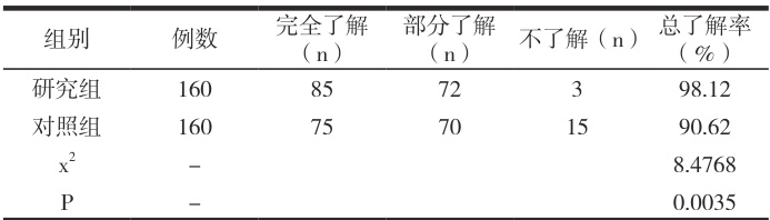 2.1 疾病知识了解程度研究组疾病知识了解率较高, P<0.05 ,见表 1。