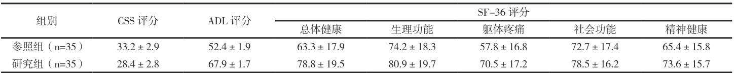 分析观察两组在 CSS 评分、ADL 评分、SF-36 生活质量评分方面的差异表现。⑴通过神经功能缺损量表(CSS) 评价两组神经功能缺损情况,满分 45 分,得分高,表明神经功能缺损越严重。 ② 通过日常生活能力量表 (ADL) 评价两组日常生活自理能力情况,满分 100 分,得分越高,表明日常生活自理能力越好。 ③ 通过 SF-36 量表评价两组生活质量,满分100 分,得分越高,生活质量越高[6]。