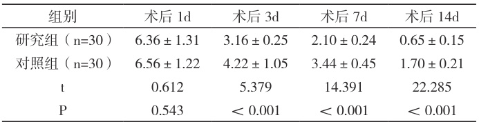 疼痛程度。视觉模拟量表(VAS)评价 [2],分值设定 0~10 分,分数低,个体疼痛程度低。测定节点:术后1d、3d、7d、 14d