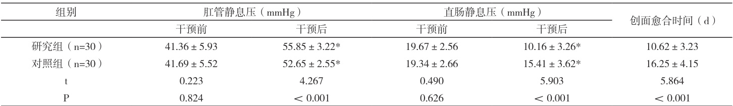 创面愈合时间、肛肠动力学。汇总 2 组创面愈合时间,同时于干预前后观察钢肛肠动力学指标,主要包括:肛管、直肠静息压。