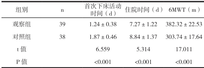 观察组首次下床活动时间、住院时间均短于对照组(P<0.05);观察组 6MWT 高于对照组(P<0.05)。见表2。