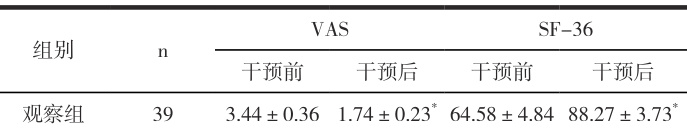 2.2 两组疼痛症状和生活质量比较干预后,观察组VAS 评分低于对照组,SF-36 评分高于对照组(P<0.05)。见表3。