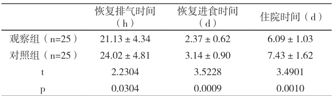 我院于 2024 年 1 月 -2025 年 2 月接收了 52 名胃肠外科手术患者,经综合比对本研究的纳入及排除标准,共纳入了 50 例参与研究,其中,男26 例,女24 例,年龄在40-70 岁之间,平均( 60.73±2.86 )岁。利用随机数表法将患者分为对照组、观察组两组,两组患者一般资料对比无明显差异( P>0.05 )。