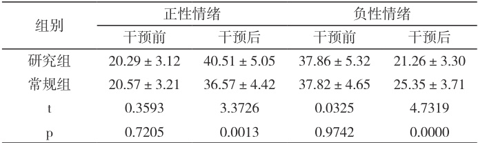 干预前两组患者正性、负性评分比较差异并无统计学意义( ΔP> 0.05),干预后,研究组的正性评分和负性评分均要优于常规组。