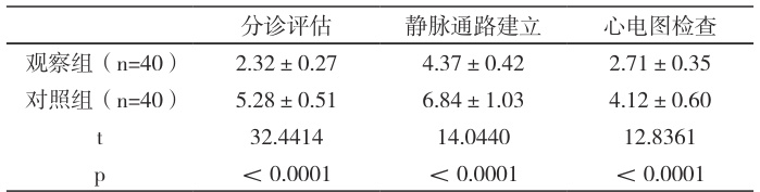 观察组则在常规流程基础上实施系统性优化,通过多维度调整护理策略以提升抢救效率。在分诊评估环节采用动态分级分诊制度,结合患者主诉、生命体征及初步检查结果,将心梗疑似病例优先纳入绿色通道。分诊护士经过专项培训,能够快速识别典型心梗症状,并在5 分钟内完成初步评估,显著缩短分诊时间。其次,在建立静脉通路方面,观察组通过优化资源配置,提前在急诊科配备标准化静脉穿刺包,并由经验丰富的护士团队执行“即刻穿刺”策略,确保患者入院后尽快完成静脉通路建立,避免因等待其他科室支持而延误治疗。此外,心电图检查环节引入信息化管理系统,通过智能调度算法优先安排心梗患者检查,同时由心电图技师与急诊医生协同操作,确保心电图记录在3 分钟内完成。