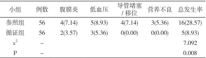 3. 其他并发症:统计组间发生腹膜炎、低血压、导管堵塞 / 移位、营养不良等并发症情况,按并发症总数/ 总例数×100.00% 计算总发生率。