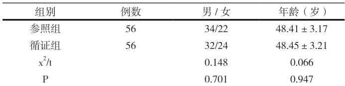 选取 2022 年 1 月~ 2024 年 10 月期间我院接收的 PD 患者 112 例,纳入标准 :①年龄≥ 18 岁 ;②经 医生结合临床各项诊断依据后推荐使用 PD 疗法;③认同本次研究且能积极配合者;④逻辑思维清晰、认 知功能正常;排除条件:①年龄≥ 60 岁;②患有腹膜炎等腹部疾病者;③具有心、肝、肾等功能障碍者, 依照病例号排序法分成参照组和循证组,组间资料对比无差异(P > 0.05),具体内容详见表 1。