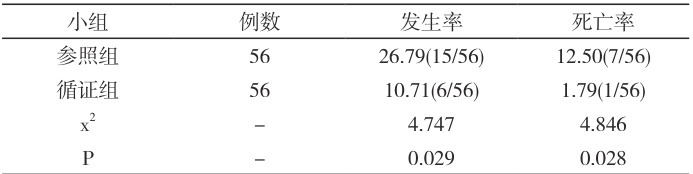 2.3 组间其他并发症对比循证组的其他并发症的总发生率低于参照组( ⋅P<0.05 ),具体见表4。表4 组间其他并发症对比(n,%)