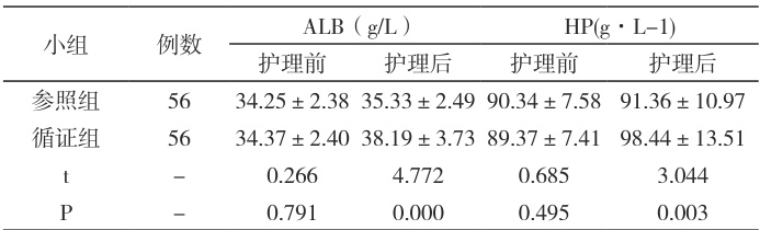 2.2 组间营养状况对比护理前组间的营养指标互比无差异 ⋅P>0.05 );护理后循证组的营养指标高于参照组(