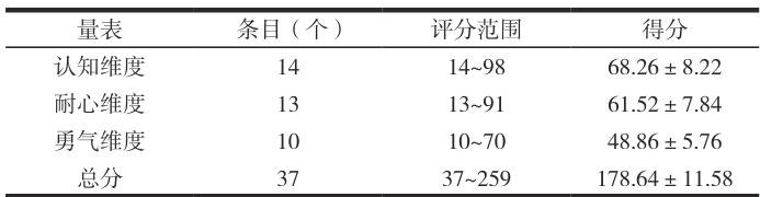 采用人文关怀能力评价量表(CAI)[3] 评估手术室护理人员的人文关怀能力。量表包括认知(14 个条目)、耐心(13 个条目)、勇气(10 个条目)3 个维度,共 37 个条目。采用 Likert 7 级评分法,每个条目根据非常不同意 ~ 非常同意评分 1~7 分,总分为 37~259 分,分值越高表示人文关怀能力越强。量表的Cronbach’s α 系数为 0.840,信效度良好。