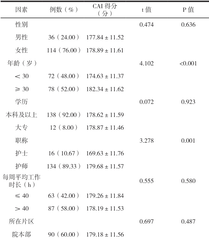 表 2 手术室护理人员 CAI 得分单因素分析 [n=150,( x ± s )]