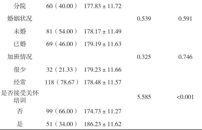 )表示,进行 t 检验。采用多元线性回归分析手术室护理人员人文关怀能力的影响因素。以P<0.05 表示差异有统计学意义。