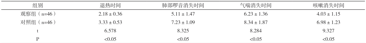 选择2024 年1 月~2025 年2 月在我院治疗的支气管肺炎患儿92 例,随机分为观察组和对照组。观察组46 例,男24 例、女22 例,年龄2-9( 5.64±0.73 )岁。对照组46 例,男25 例、女21 例,年龄3-8( 5.05±1.02 )岁。组间资料吴明显差异 P>0.05 。