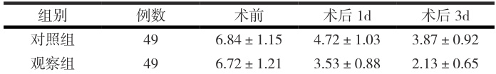 观察组术后1d、3d 的VAS 评分显著低于对照组( P<0.05 ),见表1。表1 两组VAS 评分比较(分,