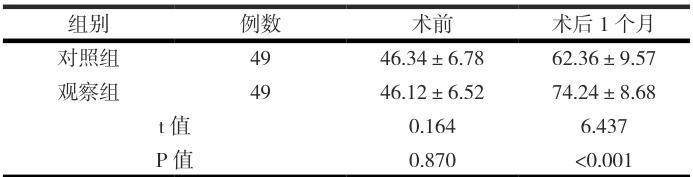 观察组术后1 个月HHS 评分显著高于对照组( P<0.05 ),见表 2
