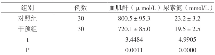 根据表 1 数据,经过 3 个月的治疗后,干预组患者的血肌酐和尿素氮指标明显优于对照组,两组间差异具有统计学意义( P<0.05 )。
