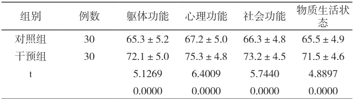 如表 2 所示,经过护理干预,干预组患者在生活质量的各项指标评分上都明显优于常规组,两组比较具有显著性差异( P<0.05 )。
