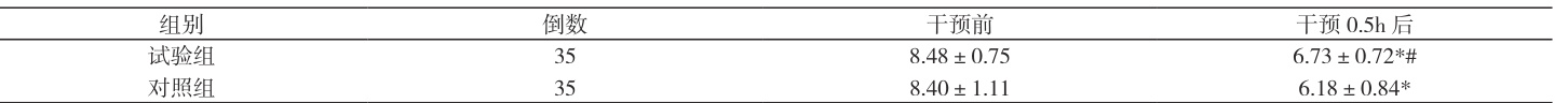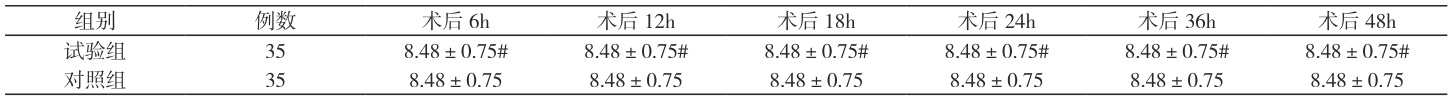 干预后 0.5h ,两组患者的VAS 评分均低于同组干预前,差异有统计学意义( P<0.05 );试验组患者干预 0.5h 后的VAS 评分高于对照组,差异有统计学意义( P<0.05 )。见表1。术后 6、12、18、24、36、 48h ,试验组的VAS 评分均低于同时点对照组,差异有统计学意义( P<0.05 )。表1 VAS 评分比较见表 2。