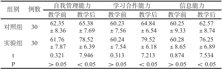此外,学习通混合教学模式的应用,让学生能够在线上学习中对重难点进行实时检索,有效提高学生信息获取能力。课前和课后学生自己安排小测时间,帮助学生培养独立思考的能力,并且学会合理安排自己时间,让学生更加自律。在本次研究中,教学前进行学习通混合式教学模式的实验组和常规教学模式的对照组,儿科护理教学学习能力评分数据差异无统计学机制( ∣P>0.05 )。教学后,进行学习通混合式教学模式的实验组自我管理能力、学习合作能力、信息能力评分,均高于对照组,数据差异存在统计学价值( P<0.05 )。