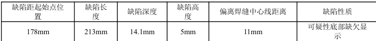 从底片上,见到一条长 210mm,有一定宽度的黑色影像,经分析,可判定为管道内表面凹槽或局部减薄所造成的内表面缺欠,不属焊缝内埋藏缺陷,也不属内表面开口缺陷。