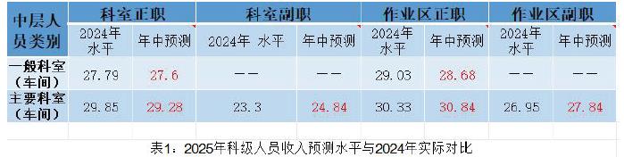1.对比2024 年实发,科级人员2025 年收入预计增减金额在-0.19 万到1.54 万之间,其中科室和作业区副职、作业区正职收入高于上年水平。具体见表1: