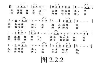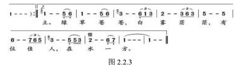 这一段是 A 段,是呈示部,以起、承、转、合的形式展开,开头为弱起,这首歌开头十分低沉,速度比较和缓,很好的融入了歌曲的感情。但曲调的起伏却很大,比如绿草、白雾、苍茫、苍茫,音调相差了一个八度,作曲家的意图就是为了凸显后一种孤独和寂静。“转”段与“有位佳人”相呼应,曲调起伏平缓,音高也比较高,表现出对佳人的向往。这一部分以主音 G 结尾,有“合”的效果。这里介绍了开始的场景,也是一个铺垫。在谱例 2 中可以看到:
