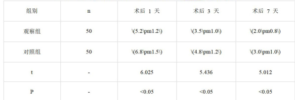 采用数字评分法(NRS)对两组患者术后 1 天、3 天、7 天的疼痛程度进行评估,结果见表 1。观察组术后 1 天、3 天、7 天的 NRS 评分均显著低于对照组,差异有统计学意义(P<0.05)。表1两组患者术后不同时间点NRS评分比较((overline{x}\pms\),分)