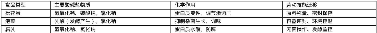 拓展课程边界需以松花蛋制作为支点,实现向传统发酵食品的知识迁移与能力转化。不同传统发酵食品中酸碱盐的作用可通过对比表格呈现(如下表),使迁移规律更清晰:
