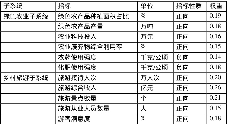 评价指标体系的构建遵循科学性、系统性、代表性和可操作性原则。从绿色农业和乡村旅游两个子系统选取指标,绿色农业子系统选取绿色农产品种植面积占比、绿色农产品产量、农业科技投入、农业废弃物综合利用率等指标,反映绿色农业的发展规模、质量和可持续性。乡村旅游子系统选取旅游接待人次、旅游综合收入、旅游景点数量、旅游从业人员数量等指标,反映乡村旅游的发展规模、经济效益和产业带动能力。具体指标体系见表 1