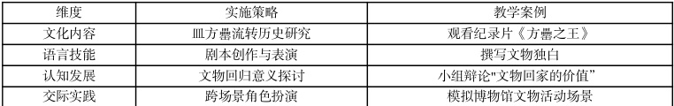 基于具身认知理论,教育戏剧通过"做中学"实现多重教育目标。语言维度方面,角色台词强化语言输出,如反复咏唱"Remember me,情感上与文物产生共鸣。同时培养了学生的语用能力,表演旁白的学生在介绍自己最喜欢的活动时I like visiting museums best。文化维度方面,文物拟人化缩短文化距离,青铜器成为会"说话"的历史见证者。情感维度方面,学生通过角色扮演培育共情能力,沉浸式体验文物离散的"乡愁"。思维维度方面,通过创设文物流落的到不同国家的情境创设促进学生深度思考,在思考和表演中理解文物回归的文化意义。